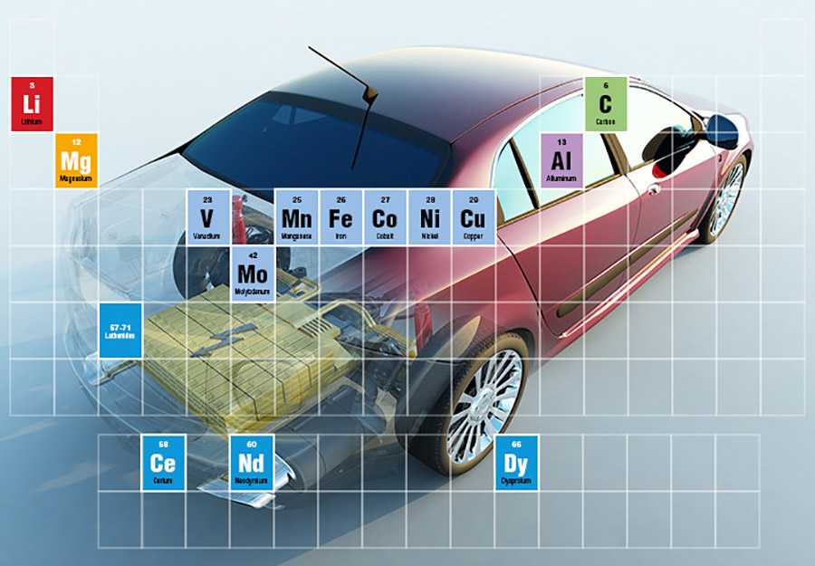 The production of an electric car requires 14 mined materials, including three times the amount of copper as a traditional combustion engine.